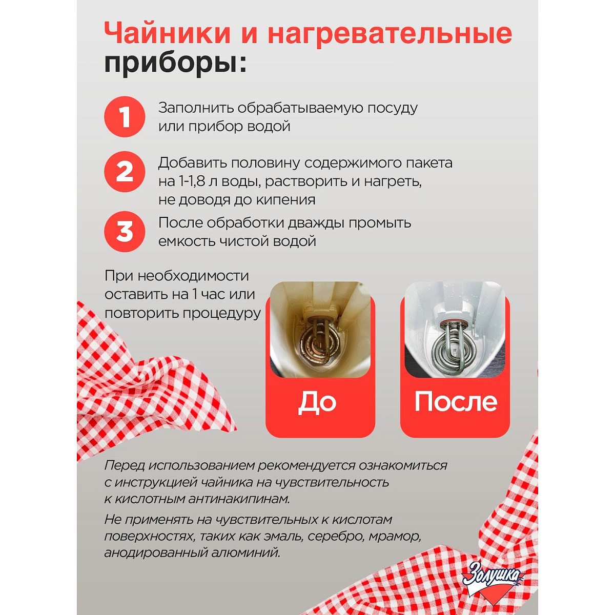 Предназначен для удаления накипи в чайниках, кофеварках, стиральных машинах, паровых утюгах и других водонагревательных приборах.